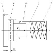 如图1所示,F1为油压力,F2为弹簧预压缩力。显而易见,盘型制动器是靠油压力 F1松闸,弹簧预压缩力 F2制动来实现其功能的。